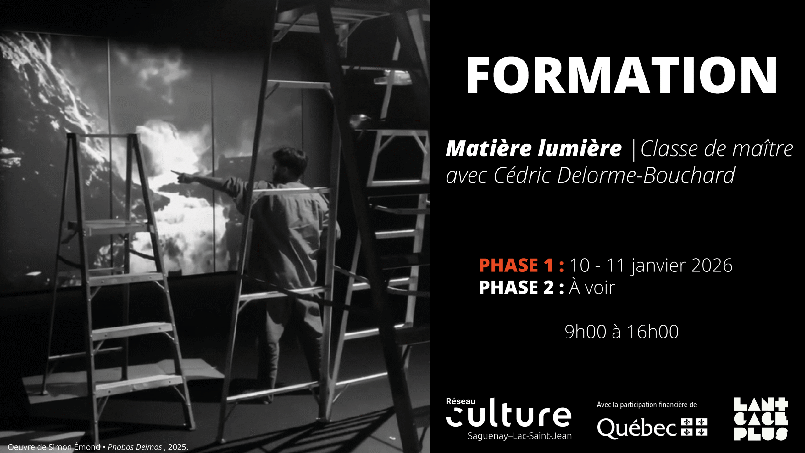 Dans le cadre du projet Phobos Deimos de l’artiste Simon Émond, présenté à Langage Plus au printemps 2025, l’artiste et le centre ont l’opportunité de collaborer avec le concepteur lumière émérite Cédric Delorme-Bouchard. Fort d’un parcours impressionnant et ayant participé à des projets multidisciplinaires de grande envergure, ce metteur en scène, scénographe et concepteur de lumière propose des avenues nouvelles et pointue d’exploitation de la lumière afin d’optimiser l’expérience créative.