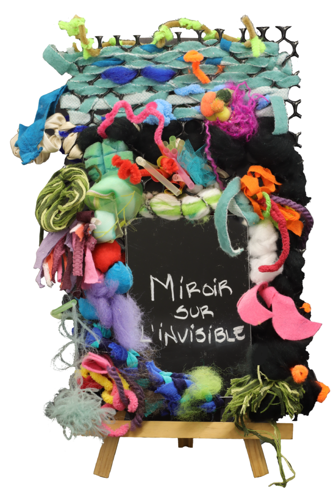 Par le miroir qui incarne à la fois la connaissance de soi et l’illusion, rappelez-vous que toute perception est filtrée, partielle et dépendante du point de vue. Des matériaux diversifiés incluant mousse, bourrures, laines et tissus colorés composeront la trame d’un monde à la fois physique et psychique.